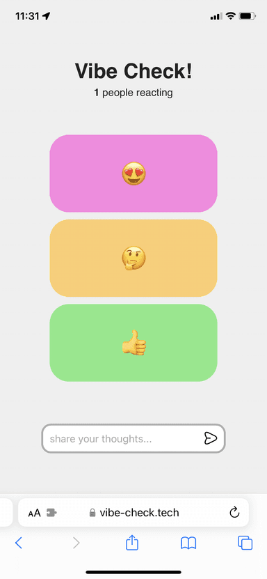 Co-built with Stan Flint ↗, vibe-check is a Chrome Extension and Website that helps make presentations more interactive. Users can react and comment on the presentation in real-time. Presenters can see real-time statistics on the vibe of the room.